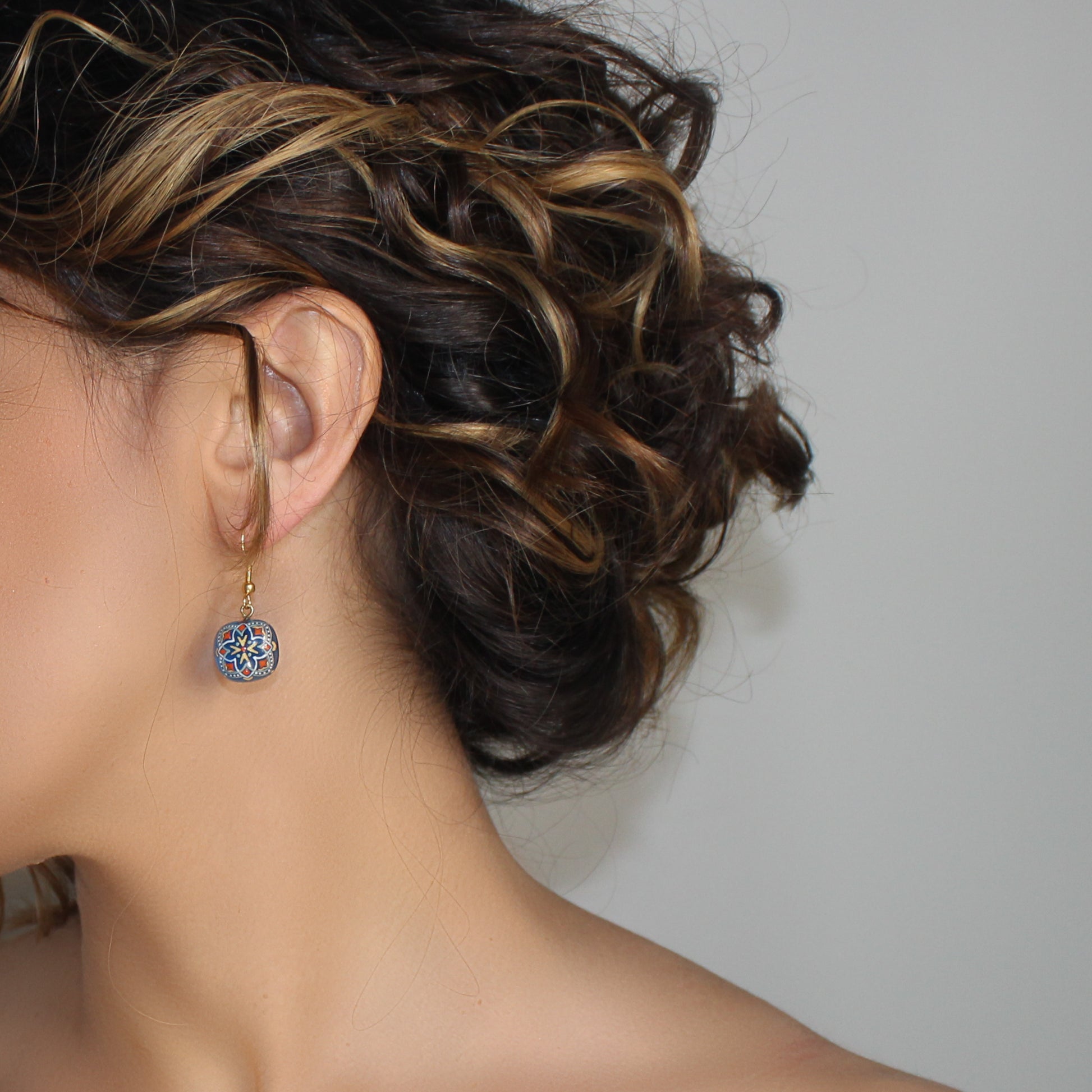 Handmade enamel earrings, blue, gold